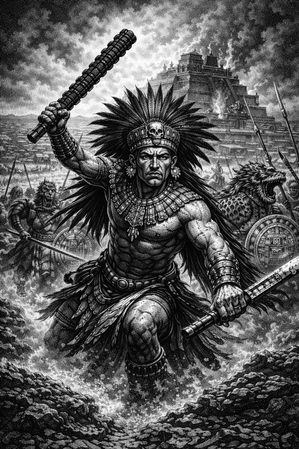 Tenochtitlan is a floating fortress and tonight it’s a butcher’s raft. War-drums hammer the air. Torches skid across wet stone. Somebody screams a prayer that turns into a choking cough. Somewhere close, obsidian bites bone with that clean, casual snick that says: this is not a battle, this is a manufacturing process.